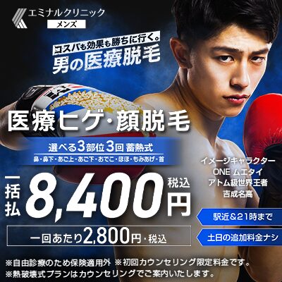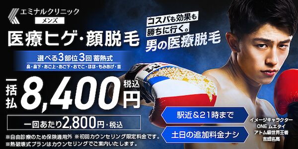 ヒゲ・顔脱毛選べる3部位蓄熱式の3回施術が一括払8,400円(税込)と格安で受けられます。他のクリニックと比較してもコスパが高いのが魅力。月々の分割払いも可能※なので、無理なく通えます。