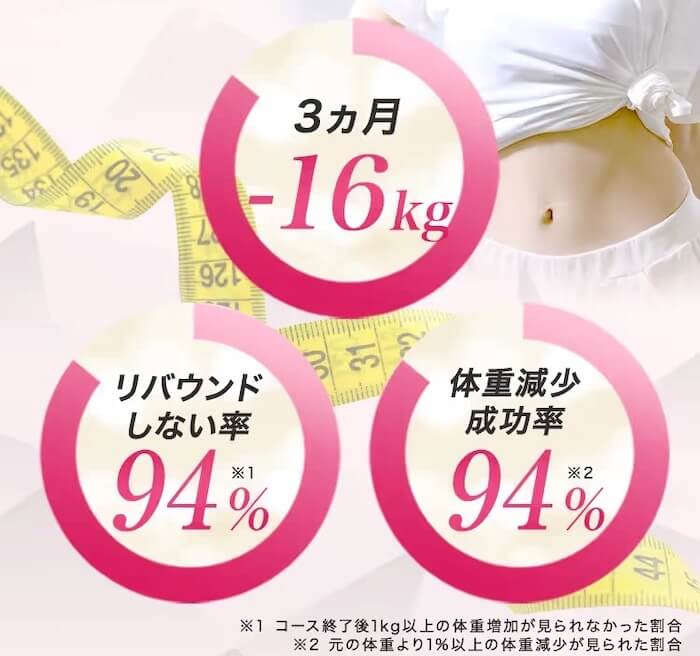 | 実績 | 3ヵ月で-15kg 成功率94% |
