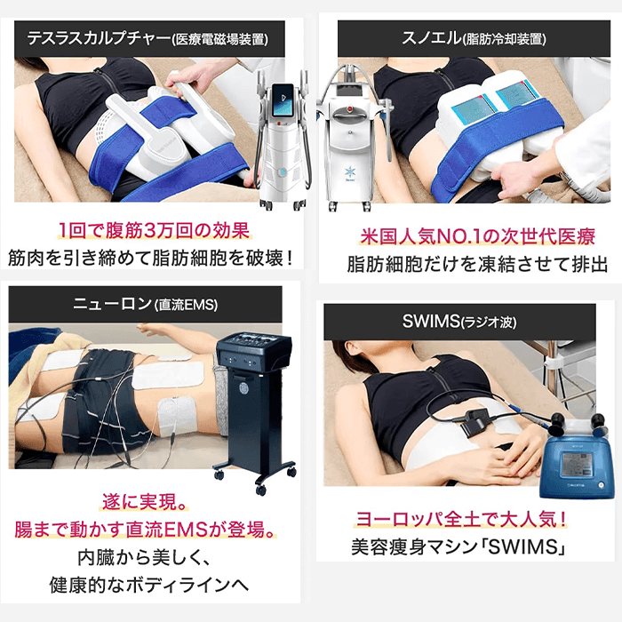 アメリカで人気の脂肪冷却マシンをはじめ、複数の医療痩身機器を組み合わせた施術が可能。