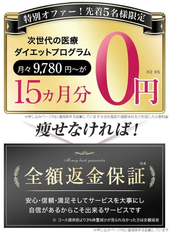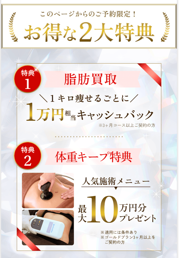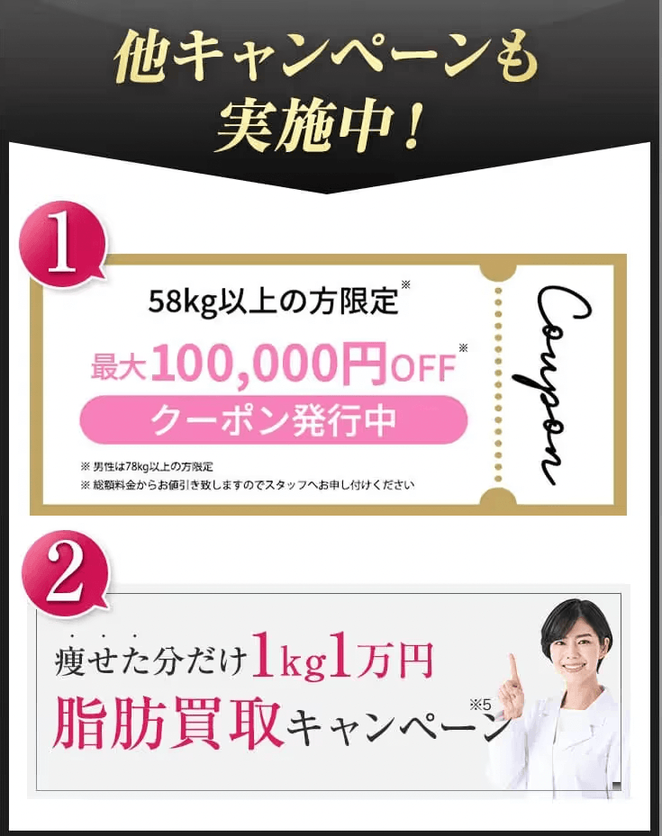 | キャンペーン | 1kg痩せるごとに 1万円を キャッシュバック |