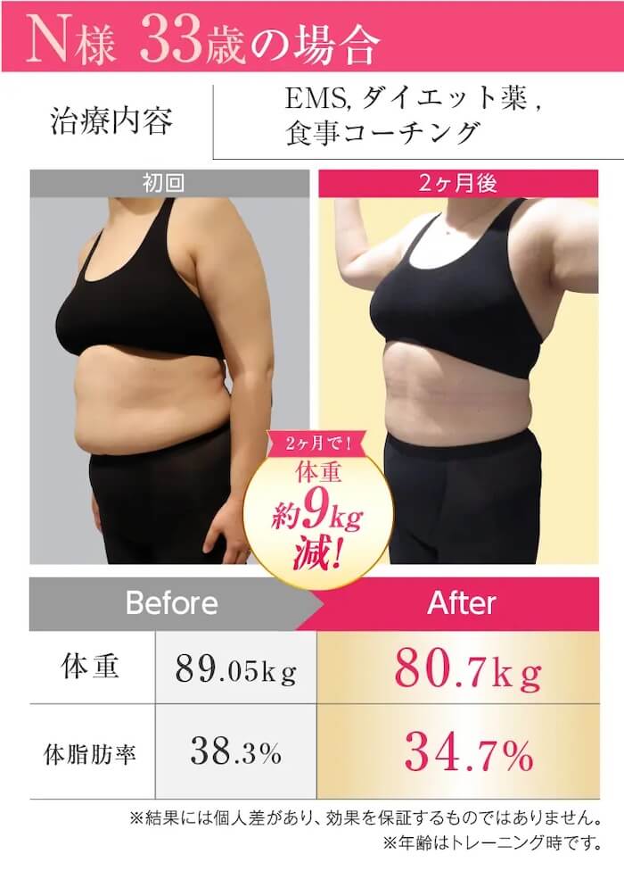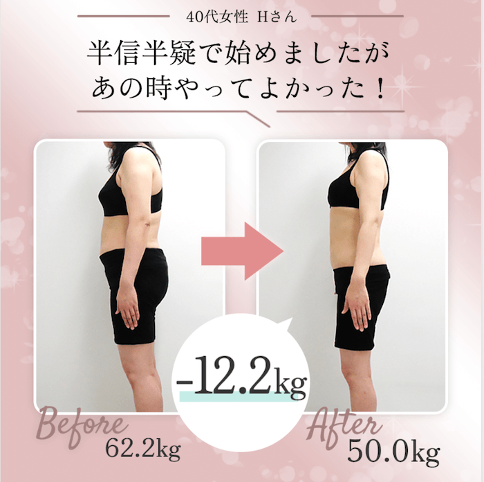 | 実績 | 3ヵ月で-12kg 減量率93% |