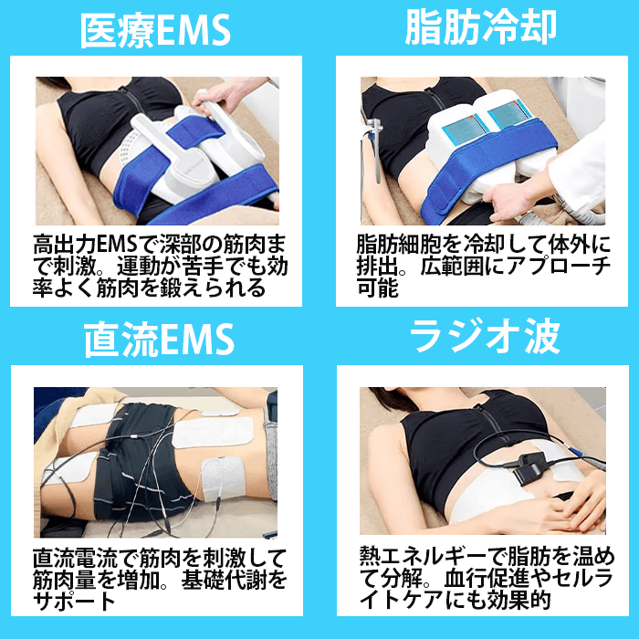 | 特徴 | 脂肪細胞を冷却して体外へ排出。脂肪細胞そのものを減らす | 電気刺激で筋肉を収縮させて脂肪を燃焼 | 筋肉量を増やして脂肪燃焼しやすい体に | 脂肪を温めて代謝を促進。 血行促進やむくみ改善 |
